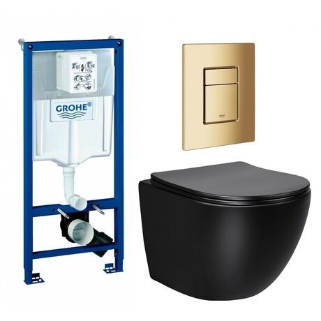 Планируете установить подвесной унитаз, но не хотите искать комплектующие по отдельности? Этот набор включает инсталляцию, унитаз и кнопку смыва — всё приедет в одной поставке. Дополнительный бонус: гарантия 5 лет от немецкого производителя Grohe. Три главных преимущества: - Безободковая чаша — нет труднодоступных мест, где скапливается грязь. Чистите унитаз за 2 минуты влажной салфеткой - Антивсплеск — специальная геометрия чаши исключает брызги при использовании - Микролифт в комплекте — сиденье из дюропласта опускается бесшумно и не бьется о чашу Для каких помещений подходит: Минимальная площадь санузла — 2,5 м². Инсталляция занимает 50×48,5 см по полу и 23 см в глубину стены после монтажа. Подойдет для квартир, загородных домов и коммерческих помещений с современным ремонтом. Черная матовая чаша хорошо смотрится в минималистичных интерьерах. Кнопка смыва в цвете золото добавляет акцент — можете поддержать его смесителями или аксессуарами в той же гамме. Особенности монтажа: Высота инсталляции — 113 см. Крепится к капитальной стене или в пол. Подвод воды — сбоку или сзади бачка, выбирайте удобный вариант под вашу разводку. Горизонтальный выпуск — канализационная труба входит прямо в стену. Межосевое расстояние под крепежные шпильки — 18 см. Высота чаши от пола — 36 см, стандарт для большинства пользователей ростом от 160 см. Технические характеристики: - Диаметр слива 9 см — справляется с объемом воды за один смыв - Пневматическая кнопка — работает от давления воздуха, не требует электричества - Антигрязевое покрытие — фарфор обработан составом, который отталкивает налет и бактерии - Вес комплекта 43 кг — учитывайте при доставке на этаж Что в комплекте: - Инсталляция Grohe Rapid SL - Подвесной унитаз с креплениями - Сиденье с микролифтом - Кнопка смыва золотого цвета - Комплект для монтажа Сборка не требуется — монтаж выполняет сантехник по стандартной схеме. Всё необходимое для установки уже в наборе.Отзывы