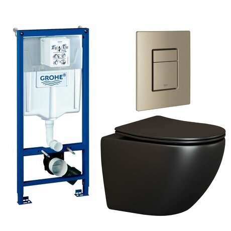 Нужна надежная сантехника, которую не придется дополнять? Комплект включает инсталляцию Grohe Rapid SL, черный подвесной унитаз и кнопку смыва — все готово к установке. Экономите время на подборе совместимых элементов и получаете **5 лет гарантии** от немецкого производителя. Три главных преимущества: - Безободковая конструкция — вода распределяется равномерно по всей чаше, не оставляя слепых зон для загрязнений - Сиденье с микролифтом и быстрым съемом — закрывается бесшумно, снимается одним движением для уборки - Система антивсплеск — особая геометрия чаши исключает брызги при использовании Для какого санузла подойдет Компактное решение для помещений от **4 м²**. Инсталляция монтируется в капитальную стену или в пол — подходит для любой планировки. Подвесная конструкция освобождает пространство под унитазом — легче мыть полы и визуально санузел кажется просторнее. Чаша высотой **39 см** — комфортная высота для взрослых и пожилых людей. Горизонтальный выпуск в стену подходит для большинства российских квартир. Технические характеристики с пользой: - Дюропластовое сиденье — не желтеет со временем, выдерживает бытовую химию и механические нагрузки - Душевой слив — вода подается по периметру чаши мягким потоком, расходуя меньше воды при смыве - Пневматическая кнопка — работает за счет давления воздуха, не требует электричества - Диаметр слива 9 см — стандартный размер с переходником на 11 см для совместимости с любой канализацией - Вес комплекта 43 кг — устойчивая конструкция без люфтов и вибраций Монтаж и подключение Инсталляция размером **113×50×23 см** — скрывается в стене, снаружи остается только кнопка и унитаз. Подвод воды сбоку или сзади бачка — выбираете удобный вариант под вашу разводку. Межосевое расстояние под крепежные шпильки **18 см** — стандарт для подвесных унитазов. Уход Черная матовая поверхность не показывает разводы от воды. Фарфоровая чаша без ободка чистится за **2 минуты** — проводите губкой по гладкой поверхности, труднодоступных мест нет. Сиденье снимается одним щелчком — моете отдельно под краном.Отзывы