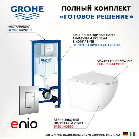 Не хотите разбираться в совместимости компонентов? Этот комплект объединяет инсталляцию Grohe, безободковый унитаз и кнопку смыва — все детали подобраны производителем и готовы к установке. Три главных преимущества: - Безободковая чаша — технология прямого смыва без труднодоступных мест. Чистите унитаз за 2 минуты вместо 10 - Экономия воды до 50% — двухрежимная кнопка расходует 3 или 6 литров за слив. При семье из трех человек экономит до 20 000 литров в год - Сиденье с микролифтом — опускается плавно и бесшумно, не разбудит домашних ночью Подойдет для санузла площадью от 3 м². Инсталляция 113 × 50 × 23 см крепится к капитальной стене или в пол, унитаз 49 × 36 см оставляет место для свободного прохода. Оптимален для квартир, загородных домов и офисов. Высота чаши 31 см — удобна для людей ростом от 160 до 190 см. Сиденье из дюропласта не желтеет со временем и выдерживает нагрузку до 150 кг. Быстросъемное крепление позволяет снять сиденье одним движением для генеральной уборки. Пневматическая кнопка с хромированной отделкой — работает без электричества, не требует батареек. Подвод воды сбоку или сзади — выбирайте удобное расположение труб при монтаже. Горизонтальный выпуск — стандартное решение для большинства российских квартир. В комплекте все необходимое для установки: крепления, прокладки, инструкция на русском языке. Не нужно докупать детали отдельно. Гарантия 5 лет — производитель уверен в качестве каждого элемента. Вес комплекта 43 кг — один человек поднимет на этаж. Сборка не требуется — устанавливаете сразу после доставки. Монтаж занимает 3-4 часа у опытного сантехника.Отзывы