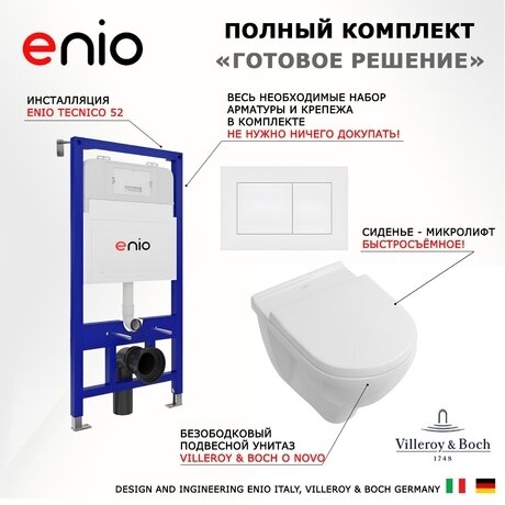 Вес комплекта 43 кг — учитывайте при подъёме на этаж Гарантия 10 лет от производителя. Дизайн унитаза от Villeroy & Boch — немецкое качество инженерии, итальянская сборка Enio. Сборка не требуется — комплект поставляется готовым к монтажу. Понадобится только профессиональная установка инсталляции и подключение к коммуникациям.
