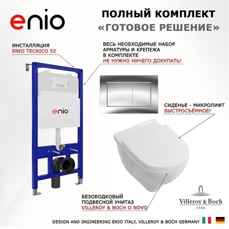 Нужно установить подвесной унитаз, но не хочется искать комплектующие по отдельности? Комплект Tecnico от Enio включает инсталляцию, безободковый унитаз Villeroy & Boch O.Novo и хромированную кнопку смыва. Приходит готовым к монтажу — не нужно докупать крепёж или арматуру. Три главных преимущества: - Безободковая чаша — нет труднодоступных мест для уборки, вся поверхность протирается за 2 минуты - Душевой слив — вода равномерно омывает всю чашу, расходуя всего 3 литра в экономрежиме - Сиденье с микролифтом — опускается бесшумно и плавно, не нужно придерживать рукой Комплект подходит для санузлов от 4 м². Инсталляция монтируется в капитальную стену на глубину 11 см, общая высота конструкции — 115,5 см. Чаша устанавливается на высоте 35 см от пола — удобно для людей ростом от 160 см. Особенности конструкции: Итальянская инсталляция Arpato Tecnico S2 — выдерживает нагрузку до 400 кг, подходит для установки в типовых квартирах с горизонтальным выпуском канализации Немецкая чаша Villeroy & Boch — фарфор с защитным покрытием, не впитывает грязь и запахи Двухрежимная кнопка — расходует 6 литров в стандартном режиме и 3 литра в экономном, экономит до 20 м³ воды в год для семьи из трёх человек Система антивсплеск — специальная геометрия чаши предотвращает брызги Сиденье из дюропласта — не желтеет и не трескается, выдерживает бытовую химию Технические характеристики: - Размеры инсталляции — 115,5 × 52,2 × 56 см, помещается в стандартную нишу - Межосевое расстояние крепежа — 18 см, универсальный стандарт для замены старой сантехники - Вес комплекта — 43 кг, можно поднять вдвоём без грузчиков - Гарантия — 10 лет на инсталляцию и арматуру Комплект поставляется в собранном виде, требуется только подключение к водопроводу и канализации. В коробке: инсталляция с бачком, унитаз, сиденье, кнопка смыва, крепёж и инструкция на русском языке.Отзывы