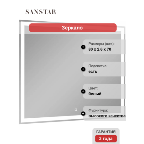Нужно зеркало, которое не занимает места и работает от касания? Oscar подходит для ванных от 4 м² — встроенная LED-подсветка по периметру включается касанием, без кнопок и переключателей. Три главных преимущества: - Сенсорное управление — включается и выключается касанием к поверхности, не нужны дополнительные выключатели - Энергосберегающая подсветка — LED-лампы мощностью 3,2 Вт потребляют в 10 раз меньше обычных - Готово к установке — в комплекте подвесы, монтируется на стену за 15 минут Зеркало подходит для небольших ванных и санузлов — размер 80×70 см при толщине всего 2,6 см. Белая пластиковая рамка вписывается в минималистичный и скандинавский интерьер. Подсветка встроена внутри полотна по периметру — свет равномерный, без теней на лице. Размеры: 80 см в ширину, 70 см в высоту — стандарт для размещения над раковиной шириной 60-80 см. Вес 10,5 кг — крепится на два подвеса к несущей стене. Подсветка: светодиодная лампа 3,2 Вт — работает до 50 000 часов, это примерно 15 лет при использовании 3 часа в день. Включается сенсором — достаточно коснуться рамки. Материалы: пластиковый корпус белого цвета — не боится влаги и брызг воды. Зеркальное полотно без искажений. Установка: не требует сборки — крепится на стену через подвесы в комплекте. Подключается к сети 220 В. Гарантия: 3 года от производителя Sanstar.Отзывы