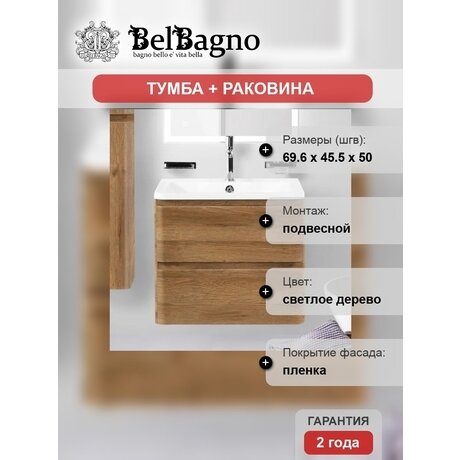 Нужна функциональная тумба для небольшой ванной? Albano от BelBagno занимает всего 70 × 45 см и помещается даже в узкое пространство. Подвесной монтаж освобождает пол — проще убирать и визуально больше места. Три причины выбрать эту тумбу: - Доводчики на ящиках — закрываются бесшумно, без хлопков. Прослужат дольше обычных механизмов - Органайзер внутри — храните косметику, щетки и средства по уходу упорядоченно. Не нужно докупать контейнеры - Литьевой мрамор — раковина не желтеет от воды и легко очищается обычным средством для посуды Для кого подойдет: Тумба решает задачу хранения в компактных санузлах — подойдет для однушек, студий или гостевых ванных. Минимальный размер помещения: 4 м². Высота 50 см удобна и взрослым, и подросткам. Светлое дерево в глянцевой пленке сочетается с белой сантехникой и светлой плиткой. Два выдвижных ящика вмещают полотенца, фен и запас бытовой химии. Характеристики: - Корпус и фасад из МДФ — не разбухает от влаги при правильной вентиляции - Глянцевое покрытие — протирается влажной тряпкой, на нем не видны отпечатки пальцев - Прямоугольная раковина 70 см — достаточно места для банных принадлежностей по краям - Подвесное крепление — установка на стену, требуется капитальная или усиленная перегородка - Вес 22,5 кг — можно установить вдвоем без профессиональных грузчиков Гарантия 2 года от итальянского производителя BelBagno. Поставляется в собранном виде — распаковали и повесили на стену.Отзывы