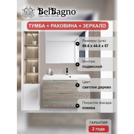 Нужен компактный гарнитур для ванной площадью от 3 м²? Vittoria от BelBagno занимает 89,6 × 44,4 см — помещается даже в типовой санузел хрущевки. В комплекте тумба с двумя ящиками, раковина из искусственного камня и зеркало. Три главных преимущества: - Подвесной монтаж — под тумбой остается место для весов или корзины, пол легко мыть - Доводчики на ящиках — закрываются бесшумно, без хлопков, механизм служит до 50 000 циклов - Раковина из искусственного камня — не желтеет от воды, не впитывает загрязнения, чистится обычной губкой Подходит для ванных комнат площадью от 3 м². Высота 57 см удобна для людей ростом от 160 см — не нужно наклоняться к раковине. Тумба вмещает полотенца, косметику и бытовую химию в два выдвижных ящика. Материалы и отделка: Корпус и фасады из МДФ — не разбухают от влажности, в отличие от ДСП. Покрытие пленкой под светлое дерево легко очищается от брызг и разводов влажной тряпкой. Матовая поверхность — на ней не видны отпечатки пальцев и капли воды. Не требует полировки после каждого использования. Искусственный камень раковины — выдерживает температуру до 80°C, не трескается от горячей воды. Царапины удаляются мелкозернистой наждачной бумагой. Кому подойдет: - Владельцам типовых квартир с маленькими санузлами - Тем, кто ценит порядок — система хранения с двумя ящиками - Семьям с детьми — безопасные доводчики защищают пальцы Поставляется в собранном виде — достаточно закрепить на стене. Гарантия 2 года от итальянского производителя BelBagno.Отзывы