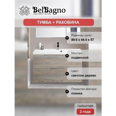 Ищете готовое решение для небольшой ванной? Тумба Vittoria от BelBagno — это подвесная конструкция 89,6 см, которая экономит место на полу и визуально увеличивает пространство. В комплекте раковина из искусственного камня — материал не впитывает влагу и легко чистится обычными средствами. Три причины выбрать эту модель: - Тихое закрывание — встроенный доводчик гасит удар, ящики закрываются бесшумно даже после 5 лет использования - Устойчивость к влаге — корпус и фасады из МДФ с матовым покрытием не разбухают от брызг - Готова к установке — приходит собранной, крепится на стену за 20 минут Подходит для ванных от 3,5 м². Габариты: 89,6 × 44,4 × 57 см — тумба поместится даже в типовой санузел хрущевки. Рассчитана на одного-двух человек: внутри два ящика для полотенец, косметики и бытовой химии. Материалы — корпус и фасады из МДФ выдерживают постоянный контакт с водой. Покрытие под светлое дерево защищено пленкой — царапины не видны, протирается влажной тряпкой. Раковина — прямоугольная чаша из искусственного камня. Не желтеет от воды, не трескается от косметики. Белый цвет сочетается с любой плиткой. Монтаж — подвесная конструкция крепится на металлические кронштейны (в комплекте). Под тумбой остается место для весов или корзины для белья. Выдерживает вес до 50 кг. Гарантия — 2 года от итальянского производителя BelBagno. Вес 27 кг — устанавливают два человека без специальных инструментов. Для кого: владельцы небольших ванных, кто ценит чистоту линий и простоту ухода. Стиль минимализм — никаких лишних деталей, только функциональность.Отзывы