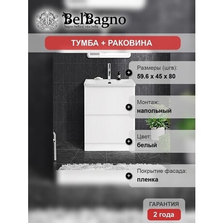 Нужна тумба для маленькой ванной, которая не займет половину пространства? Albano от BelBagno помещается в нишу шириной меньше метра — 59,6 × 45 см. При этом внутри поместятся все банные принадлежности благодаря встроенному органайзеру. Три главных преимущества: - Доводчики на ящиках — закрываются бесшумно, даже если резко толкнуть - Раковина из литьевого мрамора — не желтеет и не покрывается царапинами, в отличие от акрила - Приходит собранной — просто ставите на пол и подключаете к коммуникациям Подходит для ванных комнат от 4 м². Высота 80 см — стандарт, удобный для человека ростом от 160 см. Глубина 45 см позволяет разместить тумбу даже в узком помещении, не перекрывая проход. Целевая аудитория: владельцы городских квартир, съемного жилья, дач — все, кому нужна функциональная мебель без переплаты за бренд. Материалы: - МДФ с пленкой — корпус и фасады не боятся влаги, легко протирать - Глянцевое покрытие — визуально расширяет пространство, отражает свет - Белый цвет — сочетается с любой плиткой Эксплуатация: Напольный монтаж — не нужно сверлить стены. Просто выровняйте пол и установите тумбу. Вес 28,5 кг — справится один человек. Раковина прямоугольной формы с плоским дном — удобно мыть руки и стирать мелкие вещи. Литьевой мрамор выдерживает горячую воду и бытовую химию. Гарантия 2 года от итальянского производителя BelBagno.Отзывы