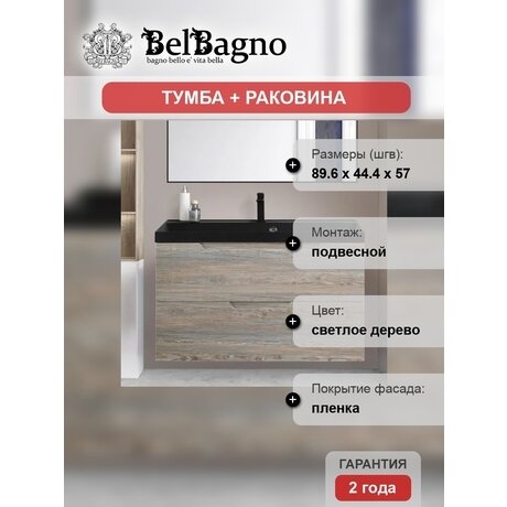 Нужна тумба для маленькой ванной? Vittoria от BelBagno освобождает пространство под собой — можно поставить весы или корзину для белья. Размеры 89,6 × 44,4 × 57 см подходят для помещений от 3 м². Три причины выбрать эту модель: Подвесная конструкция — визуально расширяет пространство и упрощает уборку пола Черная раковина из искусственного камня — не впитывает воду и чистится обычным средством для посуды Доводчики на ящиках — закрываются бесшумно, даже если захлопнуть с силой Модель подойдет для ванной в однушке или квартире-студии. Корпус из МДФ с матовым покрытием выдерживает влажность до 80%. Цвет «светлое дерево» сочетается с белой плиткой и серым керамогранитом. Особенности конструкции: Два выдвижных ящика — вмещают фены, косметику и полотенца. Высота каждого около 20 см Прямоугольная раковина — площадь чаши больше на 15%, чем у овальной такой же ширины Пленочное покрытие фасада — имитирует текстуру дерева, протирается влажной тряпкой Монтаж: крепится к стене на высоте 60–85 см от пола — выбираете удобную для себя. Вес 27 кг, выдерживает несущая стена из кирпича или бетона. Инсталляция и крепеж в комплекте. Гарантия 2 года от итальянского производителя BelBagno. Сборка не требуется — тумба приходит готовой к установке.Отзывы