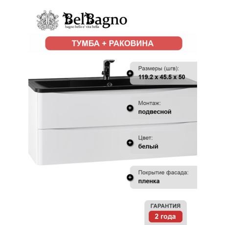 Нужна компактная мебель для ванной, где поместится всё самое необходимое? Подвесная тумба Acqua от итальянского бренда BelBagno — 119,2 × 45,5 × 50 см с вместительными ящиками и встроенными органайзерами. Плюс контрастная черная раковина из искусственного камня, которая не боится горячей воды и бытовой химии. Три главных преимущества: - Доводчики на всех ящиках — закрываются плавно и бесшумно даже при резком толчке - Органайзеры внутри — косметика, фен и средства по уходу всегда на своих местах - Подвесной монтаж — пол под тумбой легко мыть, визуально больше пространства Подойдет для ванной от 5 м². При ширине 119,2 см займет всю стену в стандартном санузле или станет центральным элементом в просторной ванной. Удобна для семьи из 2-3 человек — в ящиках поместятся полотенца, косметика и бытовая химия. Материалы: корпус и фасады из МДФ с глянцевой пленкой — выдерживают влажность и температурные перепады. Белое покрытие легко протирать влажной тряпкой, на нем не видны разводы от воды. Раковина из искусственного камня — не впитывает загрязнения, устойчива к царапинам и сколам. Технические характеристики: - Габариты 119,2 × 45,5 × 50 см — поместится вдоль стены в типовой ванной - Вес 32,5 кг — требует надежного крепления к капитальной стене - Прямоугольная раковина черного цвета — контрастирует с белым корпусом, скрывает следы от мыла - Минималистичный дизайн — без лишних деталей, подойдет к современному интерьеру - Гарантия 2 года — производитель отвечает за механизмы и покрытие Поставляется в собранном виде — достаточно закрепить на стене и подключить сантехнику.Отзывы