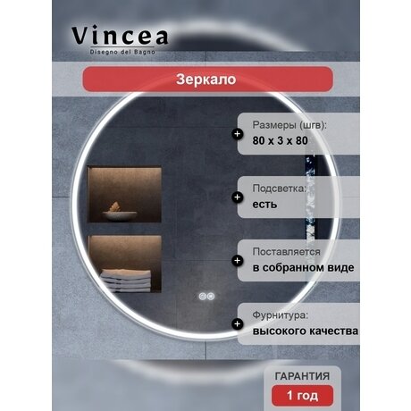 Нужно зеркало, которое не запотевает после душа? Круглое зеркало Vincea диаметром 80 см со встроенным антизапотевателем — видимость остается четкой даже в ванной с повышенной влажностью. Плюс светодиодная подсветка по всему периметру для макияжа и бритья. Три главных преимущества: - Антизапотеватель — зеркало остается чистым после горячего душа, не нужно протирать - Светодиодная подсветка внутри полотна — равномерный свет без теней на лице, экономия на счетах за электричество - Сенсорное управление — регулируете яркость касанием, не нужны кнопки и выключатели Подходит для ванных комнат от 4 м². Диаметр 80 см — оптимальный размер для одного человека, не занимает много места на стене. Глубина всего 3 см — впишется даже в узкую ванную. Для семей, пар и всех, кто ценит комфорт утренних процедур. Подвесной монтаж — крепится на стену на любой удобной высоте, подвесы в комплекте. Пластиковый корпус — легкий вес 7,5 кг, выдерживают стандартные дюбели. Светодиодные лампы — служат до 50 000 часов, это примерно 15 лет при использовании 3 часа в день. Современный дизайн — круглая форма без лишних деталей, сочетается с любым интерьером ванной. Подсветка по периметру — создает мягкий контур, работает как ночник. Сенсорный выключатель — управляете яркостью легким касанием, можно настроить под разное время суток. Гарантия 1 год — не требуется сборка, монтируется за 15 минут. Уход: протирать влажной тряпкой без абразивов.Отзывы