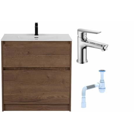 Нужна мебель для ванной, которую не придется собирать самостоятельно? Комплект Kraft от BelBagno поставляется готовым к установке — достаточно поставить тумбу на пол и подключить смеситель. В комплекте всё необходимое: тумба 80,5 см, фаянсовая раковина, хромированный смеситель и сифон. Три главных преимущества: - Система плавного закрывания — ящики закрываются бесшумно, без хлопков - Компактная глубина 39 см — подходит для узких помещений, оставляет место для свободного прохода - Полная комплектация — не нужно отдельно покупать смеситель, сифон и крепления Комплект рассчитан на ванную от 4 м². Подойдет для квартир-студий, вторых санузлов в загородных домах или съемного жилья. Тумба в цвете темного дерева сочетается с белой сантехникой и хромированными аксессуарами. Размеры в развернутом виде: ширина 80,5 см, глубина 39 см, высота 83 см. Тумба весит 34 кг — устойчиво стоит на полу без дополнительного крепления к стене. Технические характеристики: - Корпус из ЛДСП с матовым покрытием — не остаются следы от брызг воды - Фаянсовая раковина — устойчива к бытовой химии, легко чистится обычными средствами - Высота излива смесителя 9 см — удобно мыть руки и набирать воду в емкости до 15 см высотой - Система хранения с ящиками — вмещает средства для ухода, полотенца и косметику - Гарантия 2 года — BelBagno (Италия) отвечает за качество своей продукции Уход: протирать влажной тряпкой, избегать абразивных средств на корпусе. Хромированный смеситель чистить мягкой губкой с мыльным раствором.Отзывы