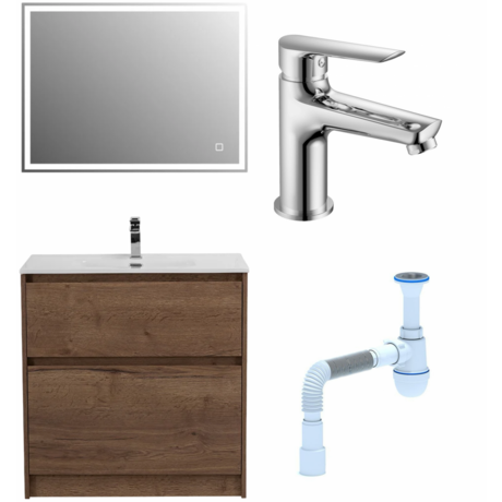 Ищете готовую ванную комнату под ключ? Комплект Kraft от итальянского BelBagno включает всё необходимое: мебель, зеркало с подсветкой, смеситель и сифон. Поставили — и сразу пользуетесь. Три главных преимущества: - Всё в одном комплекте — не нужно подбирать каждый элемент отдельно, экономия времени до 5 часов на поиск - Доводчики на ящиках — закрываются бесшумно и плавно, служат в 3 раза дольше обычных механизмов - Зеркало со встроенной LED-подсветкой — не нужно докупать и устанавливать светильники Комплект подойдет для ванной от 4 кв.м. Тумба шириной 80,5 см встанет вдоль стены и оставит место для стиральной машины или корзины для белья. Идеальное решение для тех, кто делает ремонт и хочет сразу получить функциональную ванную в стиле минимализм. Подходит для квартир, загородных домов и съемного жилья.Что входит в комплект: