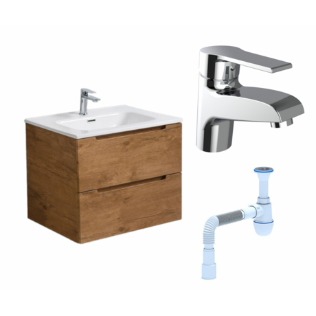 Нужно обустроить санузел и не хочется собирать мебель по частям? Этот комплект включает тумбу, раковину, смеситель и сифон — всё совместимое и готовое к установке. Приезжает собранным, остается только повесить на стену. Три причины выбрать этот комплект: - Экономия места — подвесная конструкция освобождает пол, визуально увеличивает помещение - Тихое закрывание — доводчики на двух ящиках защищают от хлопков и продлевают срок службы - Всё в одной коробке — не нужно подбирать смеситель и сифон отдельно Комплект подойдет для санузла от 3 м². Тумба занимает 61,5 × 46 см у стены, по высоте — 51,5 см. Удобно для квартир со стандартной планировкой и небольших загородных домов. Раковина — из белого фарфора с одним отверстием под смеситель. Прямоугольная форма без сложных изгибов упрощает уборку. Смеситель — хромированный, с изливом 12,2 см. Высота 13,7 см — удобно мыть руки, не задевая бортики раковины. Тумба — фасады под светлое дерево (оттенок rovere nature), корпус из МДФ с матовой пленкой. Два выдвижных ящика вмещают косметику, полотенца и бытовую химию. Механизм доводчика рассчитан на 50 000 циклов открывания. Монтаж: подвесной, крепления входят в комплект. Конструкция выдерживает до 80 кг — можно опираться при умывании. Уход: протирать влажной тканью без абразивов. Пленка на МДФ устойчива к брызгам и бытовой химии. Гарантия — 2 года от производителя.Отзывы