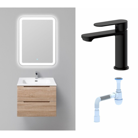 Нужно обустроить ванную комнату одним заказом? Комплект Etna от итальянского бренда BelBagno включает тумбу, раковину, зеркало с подсветкой, смеситель и сифон — всё готово к установке. Габариты 61,5 × 46 см позволяют разместить гарнитур даже в компактной ванной площадью от 4 м². Три главных преимущества: - Подвесная конструкция — освобождает пол для уборки и визуально увеличивает пространство - Доводчики на ящиках — закрываются бесшумно даже при резком толчке - Светодиодная подсветка зеркала — встроенные LED-лампы мощностью 12 Вт работают до 50 000 часов без замены Комплект подходит для ванных комнат площадью от 4 м². Глубина 46 см оставляет свободный проход, высота 51,5 см — стандартная для умывальника. Решение для квартир, загородных домов и гостевых санузлов, где нужна компактная функциональная мебель. Тумба в цвете rovere bianco — светлое дерево с фактурой дуба, покрытое матовой пленкой. Корпус и фасады из МДФ выдерживают влажность до 80% без деформации. Два выдвижных ящика с доводчиками — храните косметику, полотенца и бытовую химию без лишних звуков при закрывании. Фарфоровая раковина с отверстием под смеситель — устойчива к царапинам и пожелтению. Прямоугольная форма шириной 61,5 см дает больше полезной площади, чем круглые модели. Черный смеситель высотой излива 10,4 см и длиной 12,3 см — удобен для мытья рук и наполнения емкостей. Матовое покрытие не оставляет отпечатков пальцев. Зеркальное полотно с LED-подсветкой — включается сенсорным или электрическим выключателем. Светодиоды дают равномерное освещение без теней на лице. В комплекте: тумба, раковина, зеркало, смеситель, сифон, крепления — сборка не требуется, установка занимает 2-3 часа. Гарантия 2 года от производителя.Отзывы