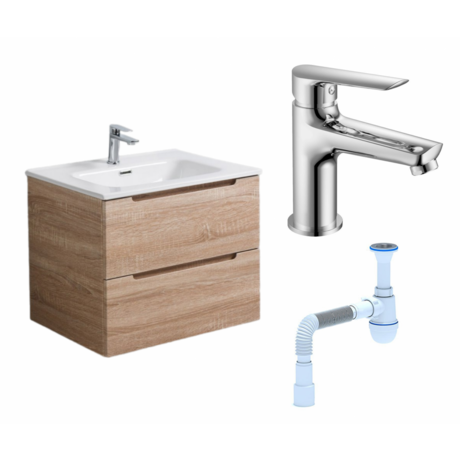Нужно обустроить небольшую ванную комнату без лишних хлопот? Готовый комплект Etna от BelBagno включает всё необходимое: тумбу с раковиной, смеситель и сифон. Устанавливается за один день, не требует сборки. Три главных преимущества: - Компактные размеры — занимает всего 61,5 см по ширине, подходит даже для маленьких санузлов площадью от 2,5 м² - Готовый комплект — не нужно подбирать раковину, смеситель и сифон отдельно, всё совместимо и готово к установке - Тихое закрывание — встроенные доводчики на ящиках защищают от хлопков и продлевают срок службы мебели Для кого подходит: Комплект решает задачу обустройства компактной ванной комнаты в квартире-студии, однушке или гостевом санузле. Минимальная площадь помещения — 2,5 м². Подвесная конструкция визуально расширяет пространство и упрощает уборку пола. Габариты: ширина тумбы — 61,5 см, глубина — 46 см, высота в подвешенном состоянии — 51,5 см. Под тумбой остается свободное пространство для весов или коврика. Практичность в деталях: Два выдвижных ящика — вмещают банные принадлежности, косметику и бытовую химию. Доводчики обеспечивают плавное закрывание даже при резком толчке. Фарфоровая раковина — не впитывает грязь и легко отмывается обычным средством. Отверстие под смеситель уже просверлено. Хромированный смеситель — высота излива 9 см позволяет удобно умываться и набирать воду в емкости. Длина излива — 12,6 см. Декор под светлое дерево (rovere bianco) — матовое покрытие из пленки устойчиво к влаге и царапинам. Нейтральный оттенок сочетается с плиткой любого цвета. Корпус и фасады из МДФ — материал не деформируется от перепадов влажности при условии работающей вентиляции. Комплектация: тумба с раковиной, смеситель, сифон, крепления для подвесного монтажа, инструкция. Сборка не требуется — тумба поставляется в готовом виде. Гарантия — 2 года на все элементы комплекта.Отзывы