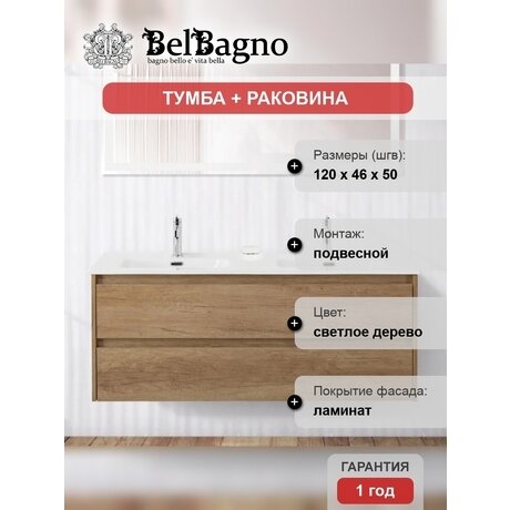 Нужна компактная мебель для ванной в малогабаритную квартиру? Тумба Kraft от итальянского бренда BelBagno занимает всего 120 × 46 см — поместится даже в санузле хрущевки площадью от 3 м². Подвесное крепление визуально увеличивает пространство и облегчает уборку. Три главных преимущества: - Механизм доводчика — ящики закрываются бесшумно и плавно, даже если их толкнуть - Встроенный органайзер — мелочи не теряются в глубине ящиков - Фаянсовая раковина в комплекте — не нужно докупать и подбирать отдельно Подходит для семей с детьми и тех, кто снимает жилье. Высота 50 см — удобно умываться взрослым и детям от 8 лет. Светлое дерево в отделке сочетается с белой сантехникой и плиткой любого цвета. Минималистичный дизайн без лишних деталей — мебель не выйдет из моды через пару лет. Корпус и фасад из ЛДСП — устойчивы к влаге и перепадам температуры в ванной комнате. Матовое покрытие не показывает отпечатки пальцев и брызги воды. Ламинированный фасад легко протирать влажной тряпкой без специальных средств. Вес 32 кг — можно повесить на стену из гипсокартона при условии усиления профилем. Прямоугольная раковина — у бортиков можно поставить дозаторы и стаканы для щеток. Гарантия 1 год — производитель уверен в качестве фурнитуры и материалов. Поставляется в собранном виде — достаточно закрепить на стене и подключить сифон. Экономия на сборщиках и времени монтажа.Отзывы
