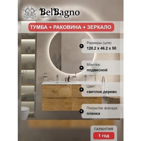 Нужна тумба, которая освободит пол и визуально увеличит ванную? Etna от BelBagno крепится к стене — под ней удобно мыть пол и хранить весы. Ширина 120 см вмещает всю косметику семьи из трех человек. Три главных преимущества: - Подвесной монтаж — освобождает 15-20 см пола, упрощает уборку - Механизм доводчика — ящики закрываются бесшумно, даже если их толкнуть - Фаянсовая раковина в комплекте — не нужно искать и подбирать отдельно Подходит для ванной от 4 м². Габариты 120×46×50 см — стандартная глубина не съедает пространство в узких комнатах. Идеально для семей и тех, кто хранит много баночек и тюбиков — выдвижные ящики дают доступ к задним рядам без перестановки. Светлое дерево (rovere nature) — имитация дуба, которая сочетается с белой плиткой и серыми стенами. Матовое покрытие не бликует при искусственном свете и скрывает отпечатки пальцев. МДФ с пленкой — устойчив к влаге, легко протирается обычной тряпкой. Материал раковины — фаянс — не впитывает грязь, легко очищается средствами без абразива. Корпус и фасады из МДФ — плотнее ДСП, держит крепеж надежнее. Вес 35 кг — выдерживает стандартное крепление к бетонной или кирпичной стене. Поставляется без сборки — установка занимает 40-60 минут. Гарантия 1 год покрывает механизм доводчика и покрытие.Отзывы