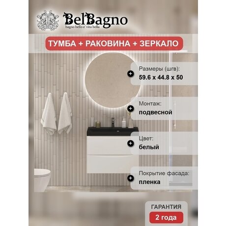 Нужна функциональная мебель в ванную площадью 3–4 м²? Marino от BelBagno — подвесная тумба шириной 59,6 см с интегрированной черной раковиной и зеркалом. В комплекте ящики с доводчиками — закрываются бесшумно даже при резком толчке. Три главных преимущества: - Подвесная конструкция — освобождает пол для уборки, визуально увеличивает пространство - Черная раковина из искусственного камня — не впитывает грязь, легко отмывается губкой без абразивов - Глянцевые фасады с пленочным покрытием — влагостойкие, не выцветают от солнца и пара Подойдет для ванных от 3 м². Габариты 59,6 × 44,8 × 50 см — поместится даже в узкий санузел в хрущевке или студии. Для семей из 2–3 человек, которым важна компактность без потери функциональности. Корпус из МДФ — не разбухает от влажности, служит годами. Глянцевое белое покрытие — отражает свет, делает ванную светлее. Ящики с доводчиками — не нужно аккуратно закрывать, механизм сам притормаживает дверцу за 3 см до закрытия. Черная раковина — практичнее белой, на ней не видны следы от воды и известкового налета. Материал — искусственный камень — не трескается от перепадов температуры, легко переносит чистящие средства. Монтаж — подвесной. Крепится к стене на специальные кронштейны (в комплекте). Под тумбой остается пространство для весов или корзины для белья. Высота от пола регулируется — можно установить на удобном уровне. Вес 20 кг — один человек повесит за 40 минут. Гарантия 2 года — производитель BelBagno (Италия) отвечает за качество фурнитуры и покрытия. Уход: глянцевые поверхности протирать микрофиброй без ворса. Раковину мыть любым неабразивным средством — гелем для посуды или мыльным раствором.Отзывы