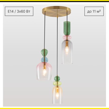 Нужен светильник, который впишется в скандинавский или эко-интерьер? Этот подвесной светильник с тремя разноцветными плафонами закроет освещение комнаты до 11 м². Подходит для кухни над столом, барной стойки или зоны отдыха в гостиной. Три главных преимущества: — Разноуровневые плафоны — создают объем и интересную игру света — Деревянная база — вписывается в эко-интерьеры и добавляет тепла — Прозрачное стекло с цветными акцентами — не перегружает пространство, но делает светильник заметным Рассчитан на помещения от 9 до 11 м². Подвесы разной длины — 51 см, 38 см и 31 см — создают каскадный эффект. Подойдет для кухни-гостиной, столовой зоны или над обеденным столом в квартире-студии. Цоколь E14 — используются компактные лампочки, которые продаются в любом магазине светотехники. Три лампы по 60 Вт дают достаточно света для основного освещения небольшой комнаты или локальной подсветки рабочей зоны. Вес 3,63 кг — требуется надежное крепление к потолку. Требует сборки — в комплекте инструкция, справитесь за 20–30 минут с отверткой и пассатижами. Производитель Citilux — бренд специализируется на декоративных светильниках в современном стиле. Китайское производство — учитывайте это при выборе ламп и уходе за плафонами.Отзывы