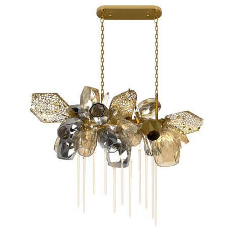 Скульптурная композиция — овальные плафоны из дымчатого стекла и золотого металла собраны в асимметричную форму, напоминающую цветок Мощное освещение — 22 светодиодные лампы суммарной мощностью 110 Вт равномерно освещают помещение до 25–30 м² Регулируемая высота — цепное крепление позволяет установить люстру на высоте от 374 см до нужного вам уровняДля каких интерьеров подходит