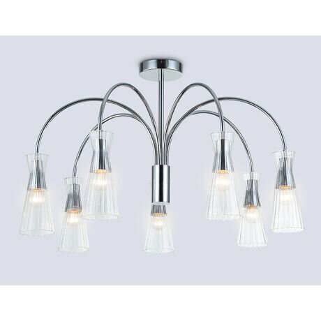 Нужна люстра для просторной гостиной? Эта модель подойдет для помещений до 23 м². Семь плафонов на гибких хромированных дугах создают равномерный свет без темных углов — не придется добавлять торшеры и бра. Три главных преимущества: - Регулируемое освещение — семь отдельных плафонов позволяют включать свет зонально через выключатель - Высота потолка от 2,6 м — люстра занимает 46 см по высоте, поэтому комфортна для стандартных квартир - Площадь освещения 23 м² — подходит для гостиных, столовых или совмещенных пространств Люстра работает в комнатах от 16 м² — в меньших помещениях диаметр 74,5 см будет визуально перегружать пространство. Подойдет для квартир с потолками от 2,6 м: при высоте 46 см останется достаточно воздуха над головой. Материалы и конструкция: Хромированная арматура — не тускнеет со временем, протирается сухой тканью раз в месяц Прозрачные стеклянные плафоны — пропускают максимум света, моются обычным средством для стекол Гибкие дуги — расходятся от центра в форме фонтана, плафоны направлены вниз для направленного освещения Технические характеристики: 7 ламп E14 по 40 Вт — стандартный цоколь «миньон», лампы продаются в любом магазине Суммарная мощность 280 Вт — можно заменить на LED-лампы 7-10 Вт для экономии электричества Степень защиты IP20 — только для сухих помещений, не подходит для ванных комнат Крепление на планку — стандартный монтаж к потолку, установка занимает 20-30 минут Вес 3,4 кг — подходит для любых типов перекрытий, включая гипсокартон с усилением Требуется сборка — в комплекте инструкция, собирается без специальных инструментов за 15 минут. Гарантия 24 месяца покрывает все элементы конструкции.Отзывы