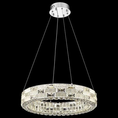 Люстра диаметром 60 см оптимальна для гостиной от 15 м². Кольцевая форма хорошо смотрится над журнальным столиком или в центре комнаты с диваном и креслами. Хромированная арматура и прозрачный хрусталь впишутся в современный интерьер, скандинавский стиль или неоклассику. Подойдет для квартир с потолками 2.7-3.2 м — тросы регулируются по высоте при установке.Технические характеристики
