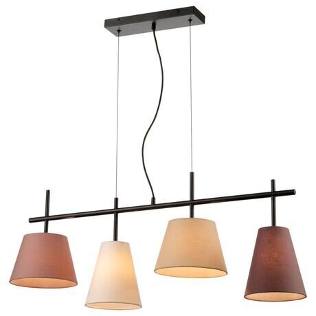 Ищете светильник, который объединит обеденную зону и добавит цветовых акцентов? Линейная люстра с четырьмя тканевыми плафонами освещает столешницу длиной до 180 см. Разноцветные абажуры в теплых оттенках — от бежевого до терракотового — создают уютную атмосферу вечером. Три главных преимущества: — Равномерное освещение — четыре плафона распределяют свет по всей длине стола без темных зон — Тканевые абажуры — рассеивают свет мягко, не создают резких теней на лицах — Регулируемая высота — подвешивается на тросах, можно настроить под высоту потолка Светильник рассчитан на помещения от 8 м². Длина планки 1190 мм — подходит для столов от 140 до 180 см. Ширина каждого плафона 200 мм — компактные конусы не загромождают пространство над столом. Подойдет для столовых зон в квартирах-студиях, кухнях-гостиных, отдельных столовых. Современный дизайн с черной арматурой вписывается в скандинавские, лофтовые и эклектичные интерьеры. Технические характеристики: — 4 лампы E14 по 40W — суммарно 160W для освещения рабочей зоны стола — Цоколь E14 — подходят обычные лампы-свечи, можно поставить диммируемые для регулировки яркости — Степень защиты IP20 — для сухих помещений, не подходит для ванных — Напряжение 230В — стандартное для российских сетей — Вес 2,7 кг — крепится на потолочную планку, выдерживает любой бетонный или деревянный потолок Требует сборки — нужно закрепить планку на потолке и подвесить плафоны на тросах. Справится один человек за 30-40 минут. В комплекте крепеж для бетонных потолков. Гарантия 12 месяцев. Производство — Италия, бренд Velante.Отзывы
