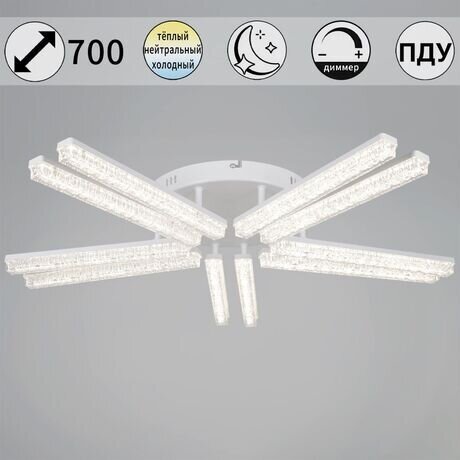 Светильник рассчитан на помещения от 15 до 20 м² — гостиная, большая спальня или кухня-столовая. Диаметр 700 мм делает его заметным акцентом в интерьере, но не громоздким.