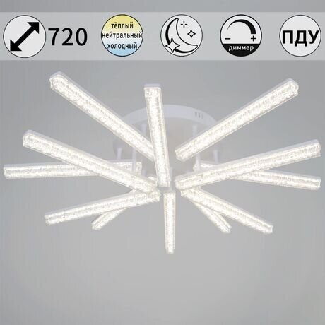 Нужен яркий свет для всей гостиной или спальни? Этот потолочный светильник освещает до 24 м² — подойдет для комнаты размером 5×5 метров. 12 светодиодных лучей дают мощность 144 Вт, а прозрачные акриловые плафоны рассеивают свет без резких теней. Три главных преимущества: - Экономия на электричестве — светодиоды потребляют в 10 раз меньше энергии, чем обычные лампы - Не нужно менять лампы — встроенные LED-модули служат до 50 000 часов (это 17 лет при 8 часах работы в день) - Геометрический дизайн — 12 лучей создают эффектную композицию, которая работает как арт-объект даже в выключенном состоянии Светильник подойдет для гостиной, спальни или кухни-студии площадью от 15 до 24 м². Диаметр 720 мм и высота всего 140 мм — впишется в помещение с потолками от 2,5 метров. Белая металлическая арматура и прозрачные акриловые плафоны сочетаются со скандинавским, минималистичным и современным интерьерами. Технические характеристики: - Мощность 144 Вт — освещает комнату так же ярко, как 14 обычных ламп по 100 Вт - Степень защиты IP20 — для сухих помещений (не подходит для ванной) - Напряжение 220В — подключается к обычной электросети без дополнительных устройств - Крепление на планку — монтируется за 20 минут, инструкция в комплекте - Вес 2,5 кг — подходит для любых типов потолков, включая гипсокартон Производство Италия, бренд Reluce. Гарантия 24 месяца покрывает все элементы, включая светодиодные модули.Отзывы