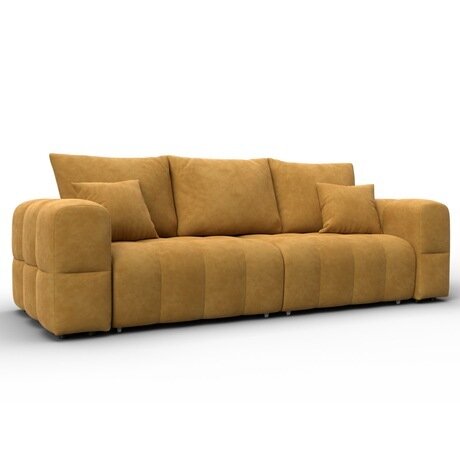 Габариты 260×98×106 см — диван встанет в гостиную от 12 м² или студию от 25 м². Желтый велюр сочетается со светлыми стенами и деревянной мебелью.