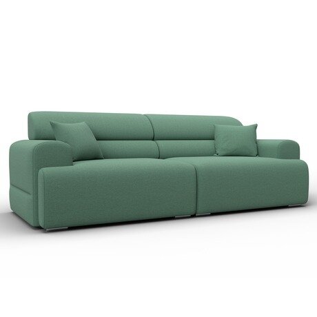 Диван производится в России брендом «Лига Диванов Плюс» из коллекции «Лига-109». Зеленый цвет рогожки сочетается с деревом, бетоном и светлыми стенами.